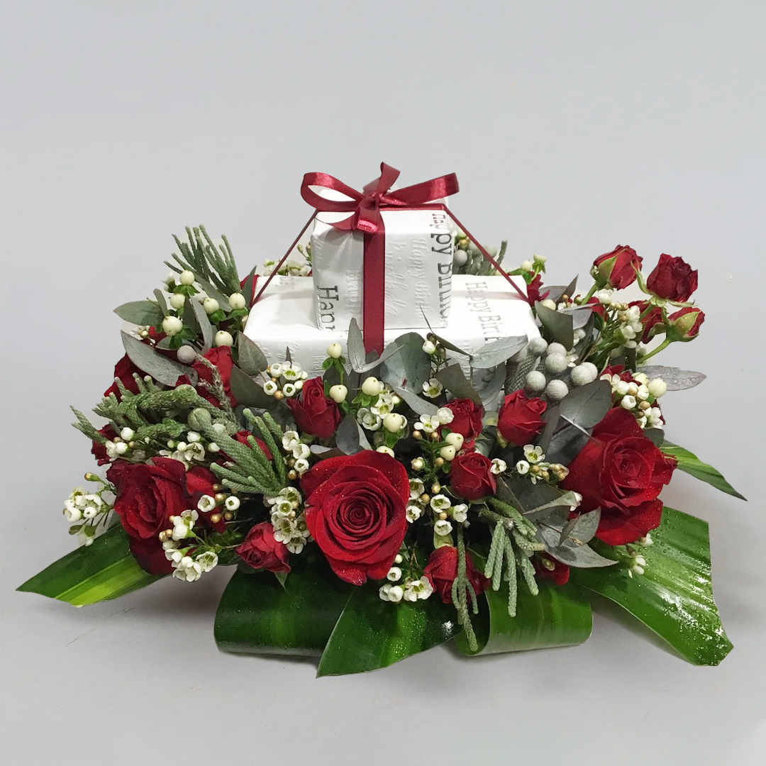 Gift arrangement decorated with red roses,silver brunt, wax flower and baby roses.