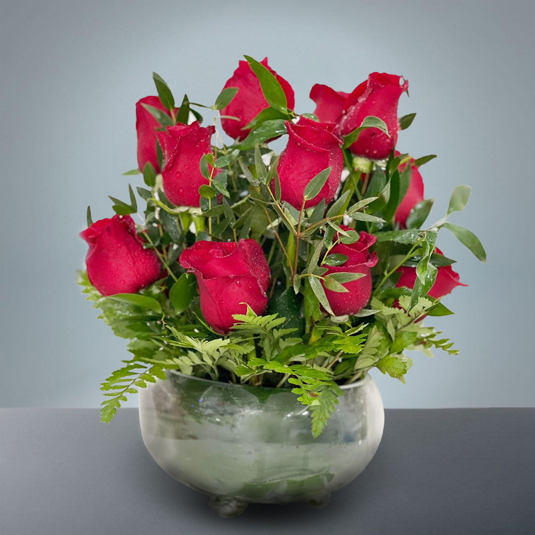 Red rose arrangement with glass vase leather leaf and eucaliptus.