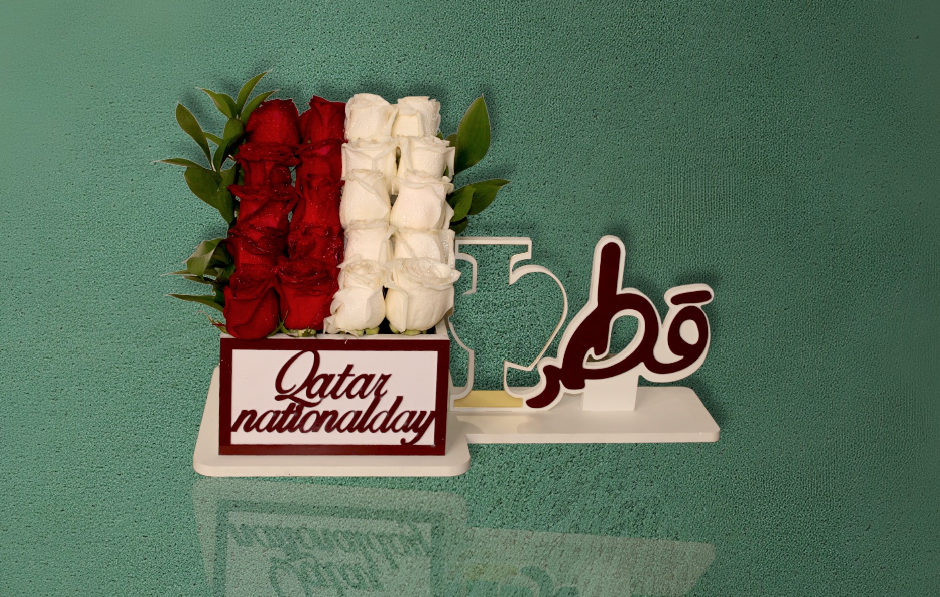 Box arrangement of roses, and ruscus.
