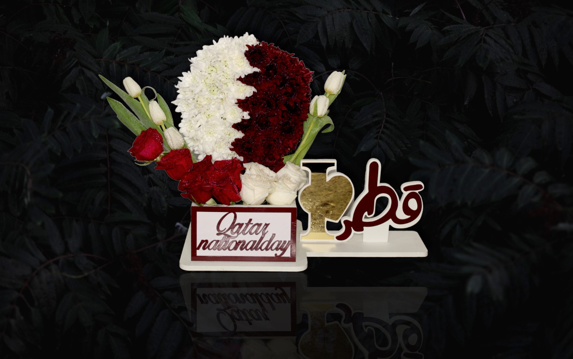 Arrangement of rose, chrysanthemum, tulip, ruscus with wooden vase.